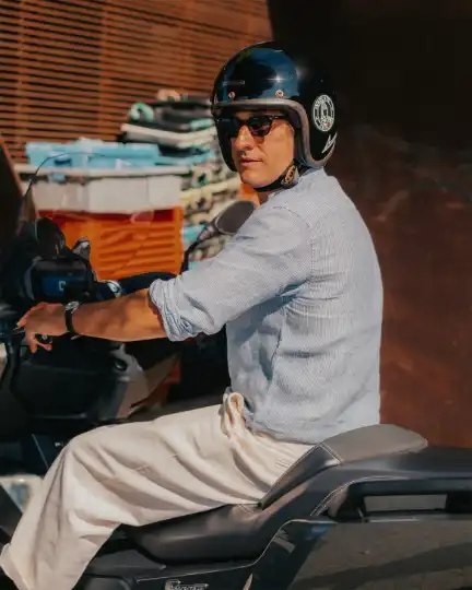 Ah, you’ve got a helmet on, so perhaps you’re not walking to work. Tell us about your vehicle of choice.